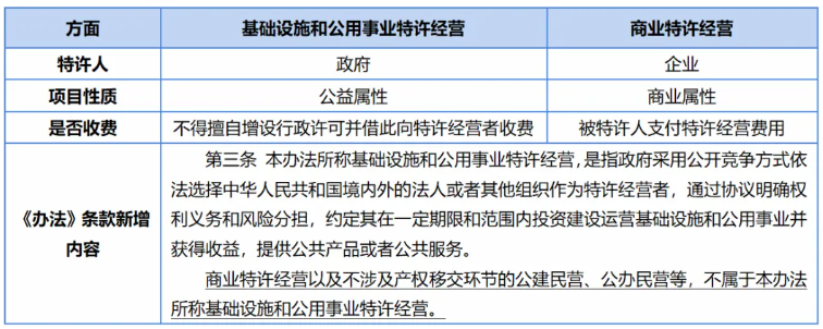 ③范圍上,基礎設施和公用事業(yè)特許經(jīng)營范圍,不包括商業(yè)特許經(jīng)營以及不涉及產(chǎn)權移交環(huán)節(jié)的公建民營、公辦民營等。