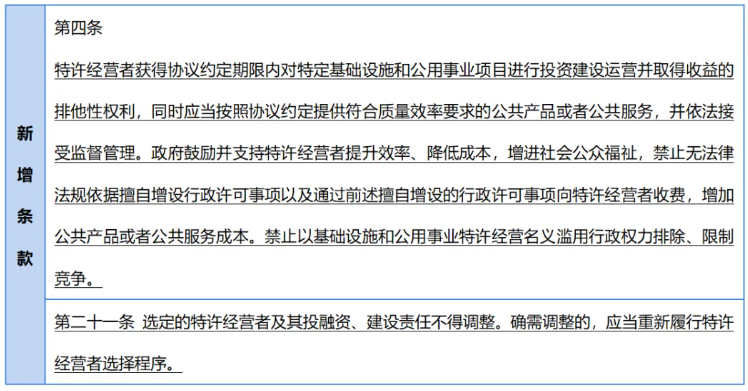 本次修訂中,于《辦法》第一條立法目的中補充“激發(fā)民間投資活力”,于《辦法》第十八條中增加明確,鼓勵民營企業(yè)通過直接投資或者獨資、控股、參股等方式積極參與特許經(jīng)營項目,根據(jù)、參照國務院發(fā)展改革部門制定的支持民營企業(yè)參與的新建及改擴建特許經(jīng)營項目清單,確定民營企業(yè)參與的具體方式。