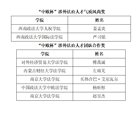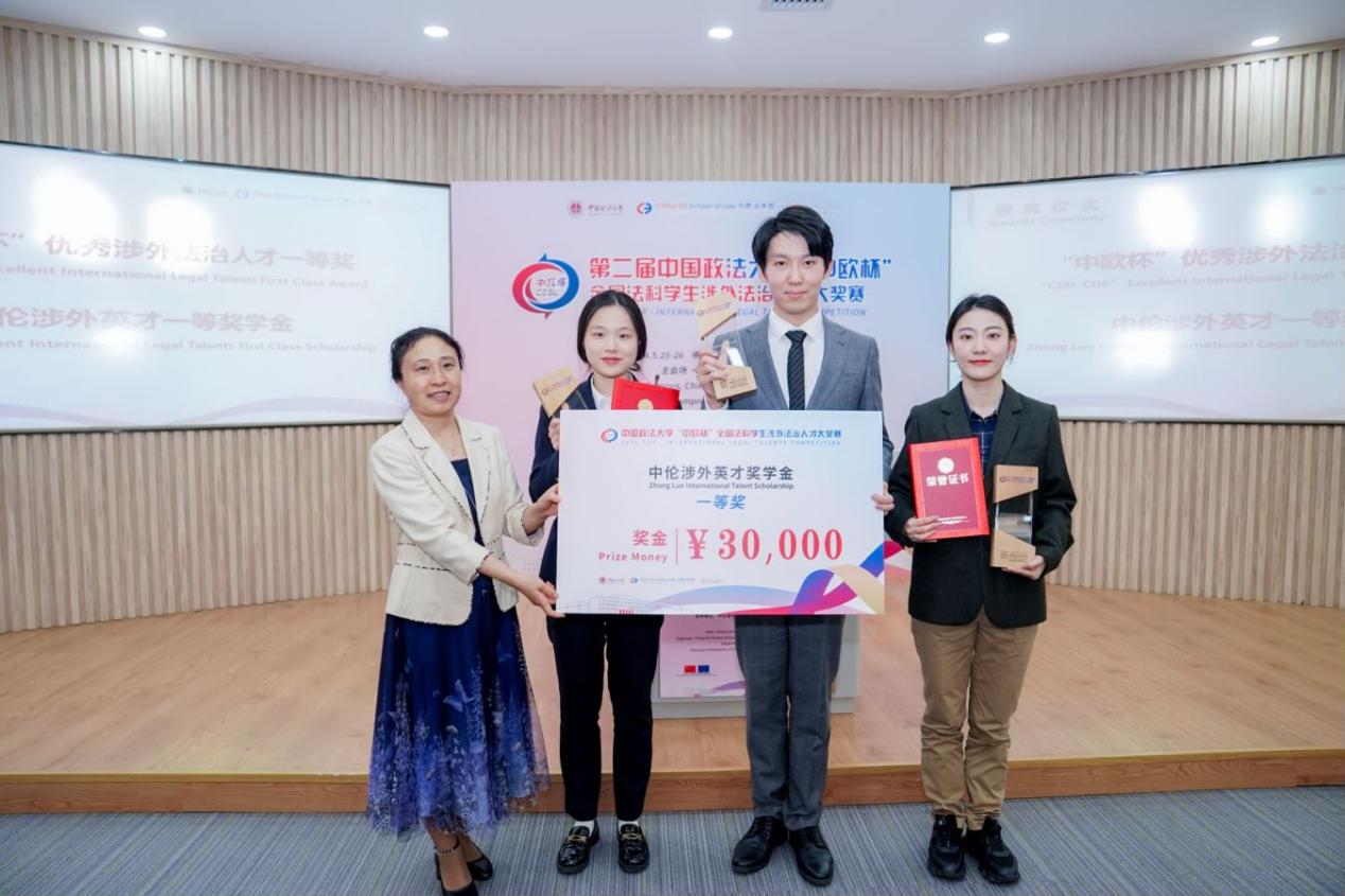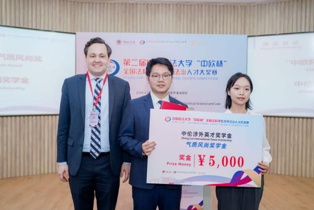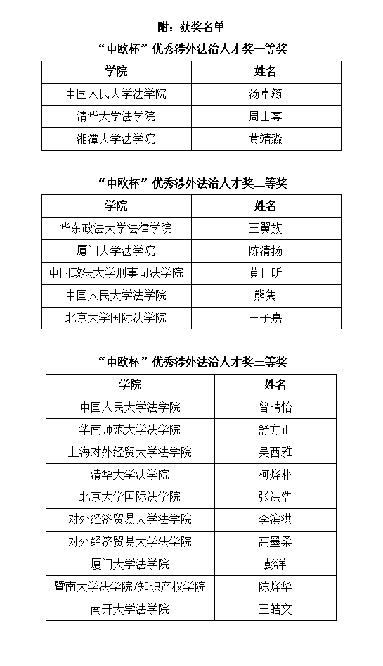 經(jīng)過(guò)激烈角逐,最終,中國(guó)人民大學(xué)湯卓筠、清華大學(xué)周士尊、湘潭大學(xué)黃靖淼3名選手榮獲“中歐杯”優(yōu)秀涉外法治人才一等獎(jiǎng)。另有22名選手分別獲“中歐杯”優(yōu)秀涉外法治人才二等獎(jiǎng)、三等獎(jiǎng)、“涉外法治人才氣質(zhì)風(fēng)尚獎(jiǎng)”“涉外法治人才團(tuán)隊(duì)合作獎(jiǎng)”等。在5月26日下午舉行的閉幕式暨頒獎(jiǎng)儀式上,中國(guó)政法大學(xué)黨委副書記王立艷、中倫律師事務(wù)所高級(jí)顧問(wèn)王霽虹等為選手頒獎(jiǎng)。獲獎(jiǎng)同學(xué)同時(shí)獲得“中倫涉外英才獎(jiǎng)學(xué)金”。