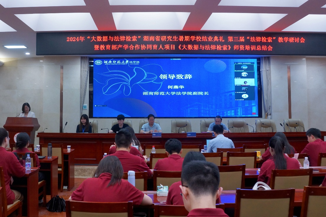 7月28日上午,2024“大數(shù)據(jù)與法律檢索”湖南省研究生暑期學校結(jié)業(yè)典禮、第三屆“法律檢索”教學研討會暨教育部產(chǎn)學合作協(xié)同育人項目《大數(shù)據(jù)與法律檢索》師資培訓總結(jié)會在湖南師范大學法學院舉行,湖南師范大學法學院副院長何燕華、湖南師范大學法學院副院長歐福永、湖南師范大學法學院副教授黃文旭、本次暑期學校班主任李部(北大法寶學堂)、湖南師范大學法學院法碩辦輔導員羅昊、大連財經(jīng)學院教師王杰彥、武漢東湖學院教師王建東、大連海事大學法學院教師吳淞豫及線上嘉賓廣東外語外貿(mào)大學教授曾赟、北大法寶副總經(jīng)理何遠瓊博士出席本次結(jié)業(yè)典禮。湖南師范大學法學院研究生工作辦公室主任王丹主持本次結(jié)業(yè)典禮。