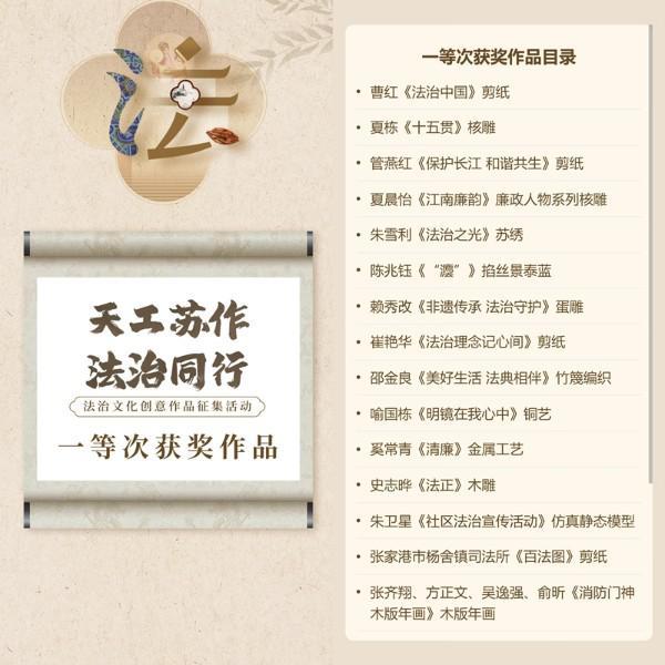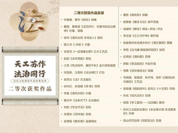 為深入實(shí)施蘇州市“八五”普法規(guī)劃,推動(dòng)法治文化與非物質(zhì)文化遺產(chǎn)深度融合發(fā)展,今年,江蘇省蘇州市委宣傳部、蘇州市司法局、蘇州市文化廣電和旅游局、蘇州市文學(xué)藝術(shù)界聯(lián)合會(huì)以“天工蘇作 法治同行”為主題在全市開展了法治文化創(chuàng)意作品征集活動(dòng),積極探索創(chuàng)新法治宣傳形式,讓法治精神和法治信仰深入人心。