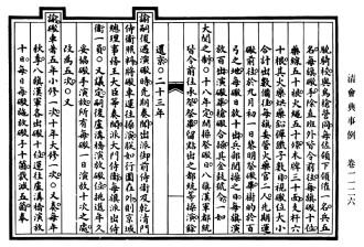 “事例”原指先前存在的成例。在中國(guó)古代,事例對(duì)后發(fā)類案之處置,多具指導(dǎo)意義。西晉時(shí),楊駿以謀反之罪見(jiàn)誅,其弟楊珧雖陳情自告仍受牽連?!爱?dāng)時(shí)皆謂宜為申理,合依鐘繇事例”,時(shí)人援引鐘繇免于鐘會(huì)之誅事,欲援救楊珧。逮至明代,“事例”已表現(xiàn)出與會(huì)典的密切聯(lián)系?!度f(wàn)歷會(huì)典》載,“其近年六部等衙門見(jiàn)行事例,各令選委司屬官,遵照體例,分類編集”。洎乎清代,“會(huì)典事例”作為一種法律形式繼續(xù)發(fā)展?!犊滴鯐?huì)典》率先厘定“事例”的類型。乾隆時(shí),認(rèn)為“夫例可通,典不可變”,典與例當(dāng)分離。遂在制定《大清會(huì)典》之余,另編《大清會(huì)典則例》180卷。嘉慶朝在編纂《大清會(huì)典》之外,又有《大清會(huì)典事例》920卷、《欽定大清會(huì)典圖》132卷。至此,“會(huì)典事例”以一種法律形式獨(dú)立于“會(huì)典”存在。