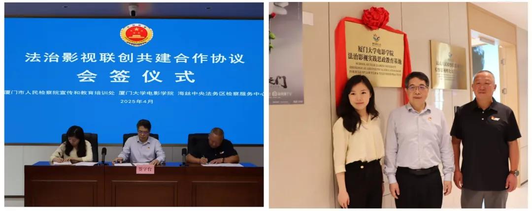 楊善良、林公明、張櫪文分別代表廈門(mén)市人民檢察院宣傳和教育培訓(xùn)處、廈門(mén)大學(xué)電影學(xué)院、海絲中央法務(wù)區(qū)檢察服務(wù)中心簽訂聯(lián)創(chuàng)共建協(xié)議,共同為“廈門(mén)大學(xué)電影學(xué)院法治影視實(shí)踐思政教育基地”揭牌。