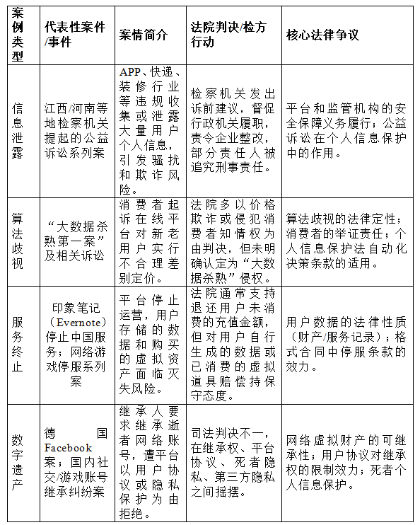 本文立足于司法實(shí)踐的視角,對(duì)大規(guī)模個(gè)人信息處理在我國(guó)引發(fā)的系統(tǒng)性法律風(fēng)險(xiǎn)及其治理路徑進(jìn)行了系統(tǒng)性考察。研究表明,隨著數(shù)字經(jīng)濟(jì)的深化,相關(guān)風(fēng)險(xiǎn)已超越了傳統(tǒng)的個(gè)人隱私侵權(quán)范疇,演化為關(guān)乎數(shù)據(jù)安全與可用性、權(quán)利行使與平臺(tái)責(zé)任平衡,以及對(duì)既有法律概念體系沖擊的三個(gè)核心維度。通過對(duì)檢察公益訴訟、算法歧視、服務(wù)終止和數(shù)字遺產(chǎn)四類典型案例的深度剖析。
