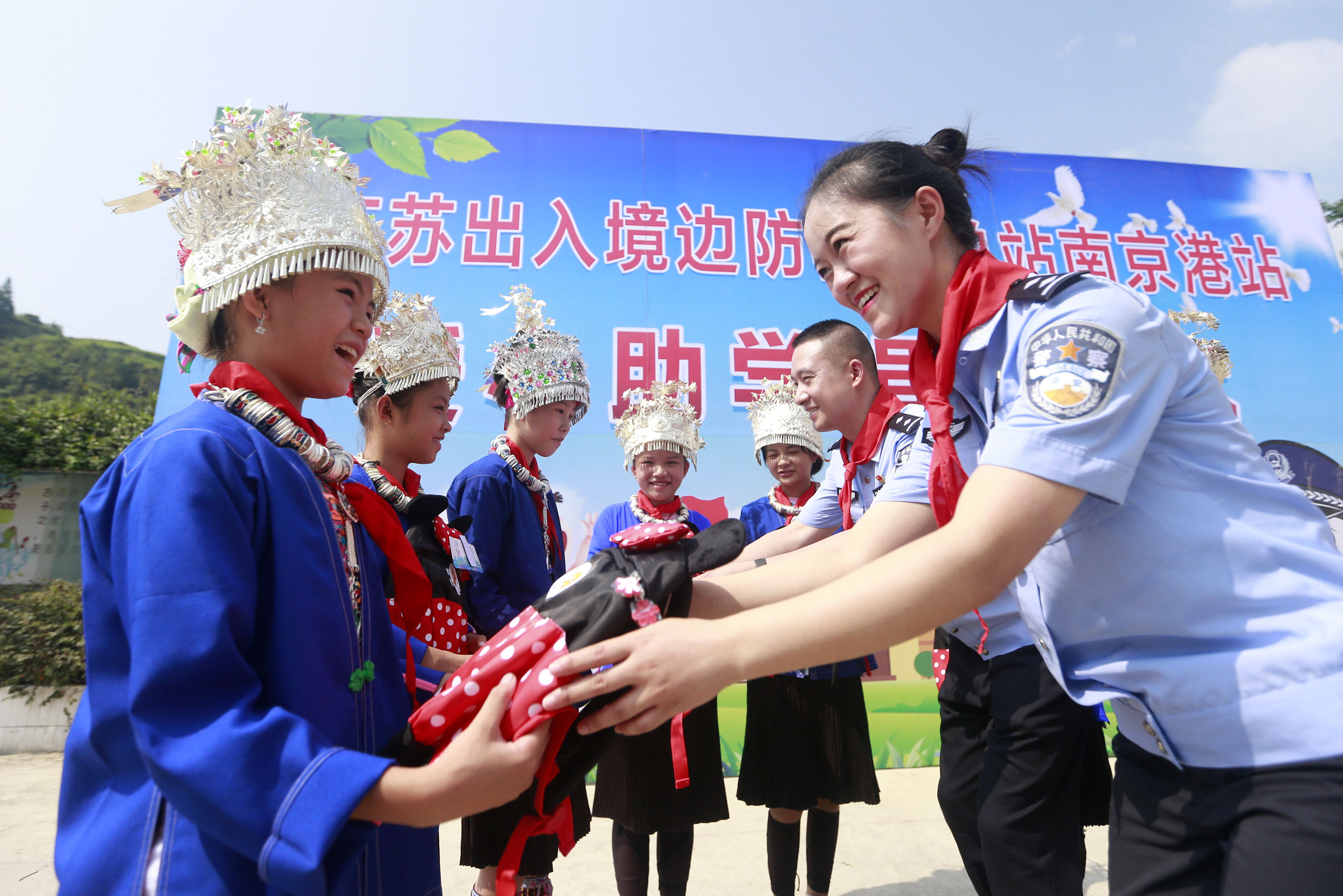 8月25日,在新學(xué)期開學(xué)之際,廣西壯族自治區(qū)柳州市三江侗族自治縣獨峒鎮(zhèn)八協(xié)小學(xué)的貧困學(xué)生領(lǐng)到了愛心書包。當(dāng)日,江蘇南京港出入境邊防檢查站民警和企業(yè)代表來到八協(xié)小學(xué)開展愛國主義教育和愛心助學(xué)捐贈儀式主題活動,為全體學(xué)生精心準(zhǔn)備了書包、學(xué)習(xí)用品、文體器材、衣物等禮物300套,讓孩子們開心快樂迎接新學(xué)期到來。