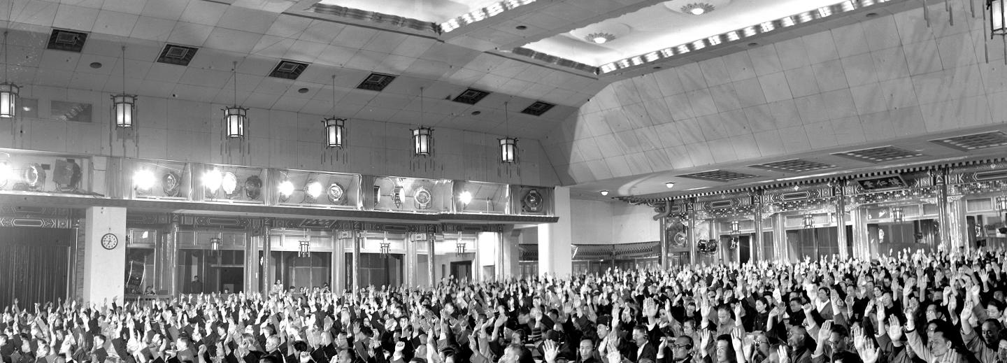 出席第一次全國人民代表大會的代表舉手通過周恩來作的《政府工作報告》(資料照片)。