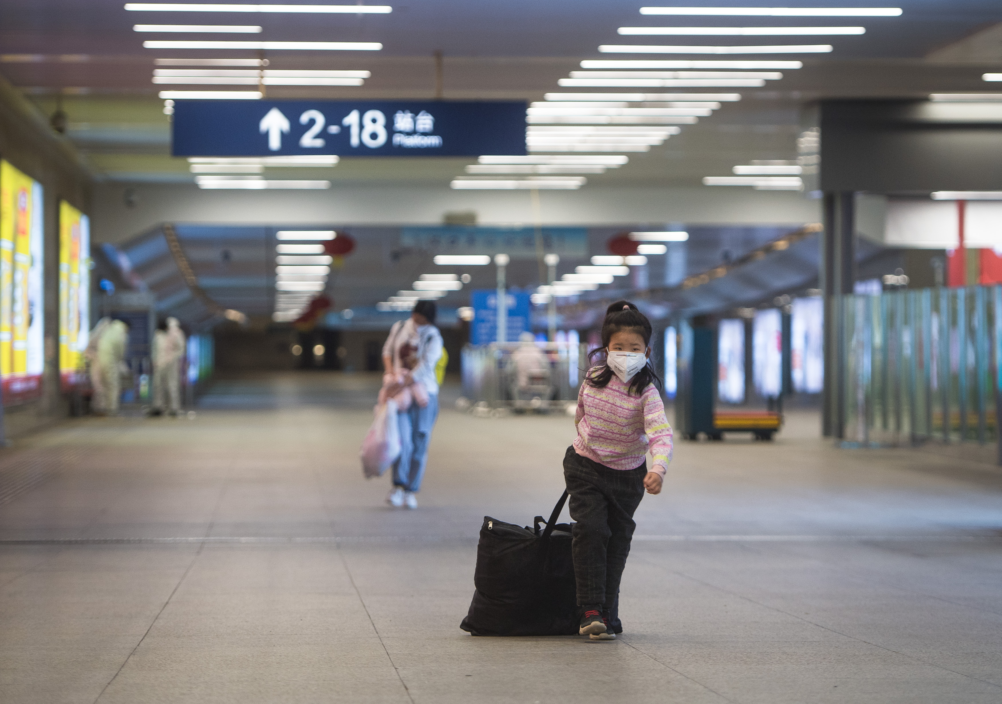 武漢恢復鐵路客站到達業(yè)務當天,在武漢漢口火車站,一名小女孩拉著行李走在家長的前面(3月28日攝)。