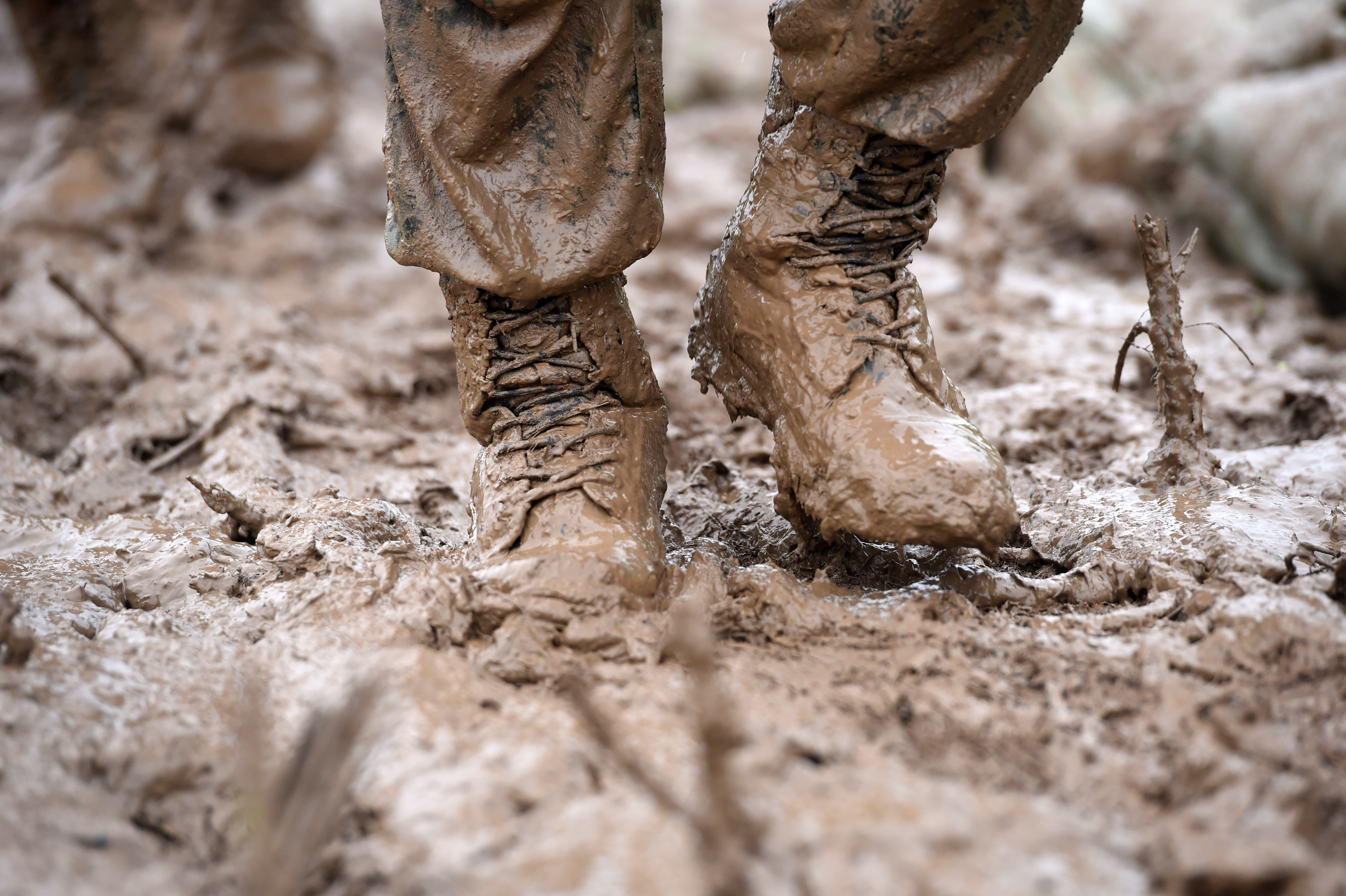 7月18日,武警安徽總隊(duì)馬鞍山支隊(duì)的戰(zhàn)士搬運(yùn)沙袋行走在和縣黃壩村的石跋河堤壩上,泥水裹滿褲腿和鞋。