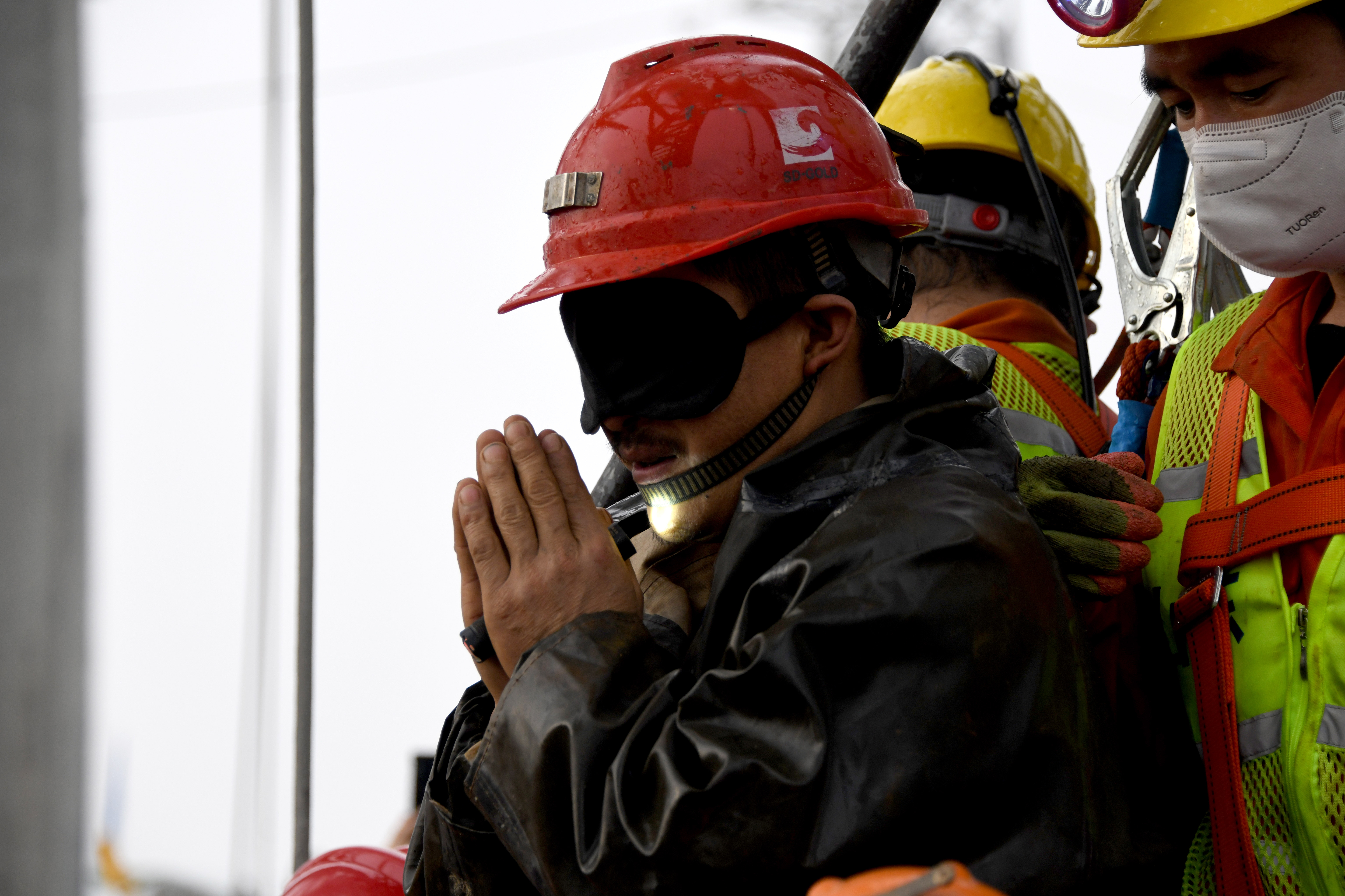 1月24日,一名被困礦工成功升井后雙手合十以表感謝。