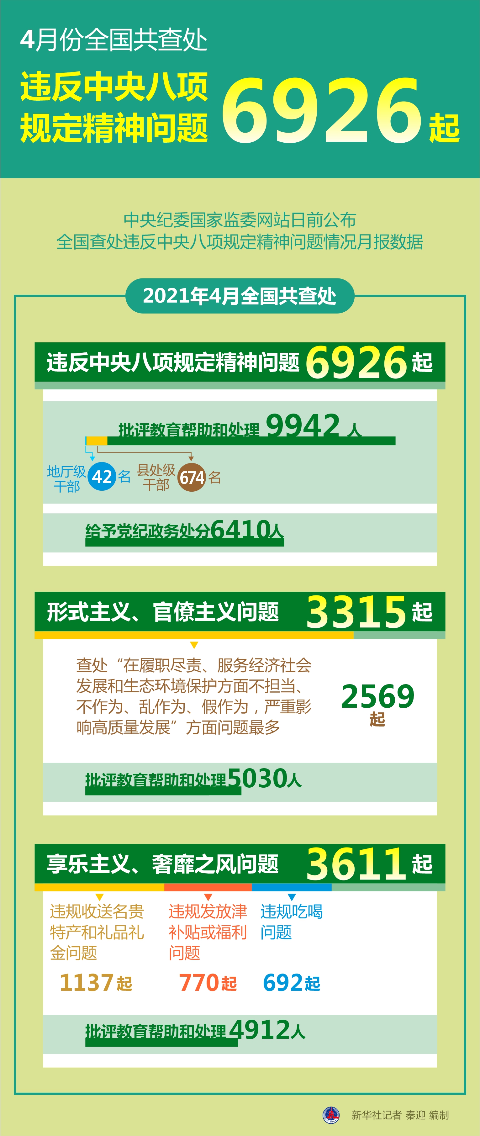 圖表:4月份全國共查處違反中央八項規(guī)定精神問題6926起