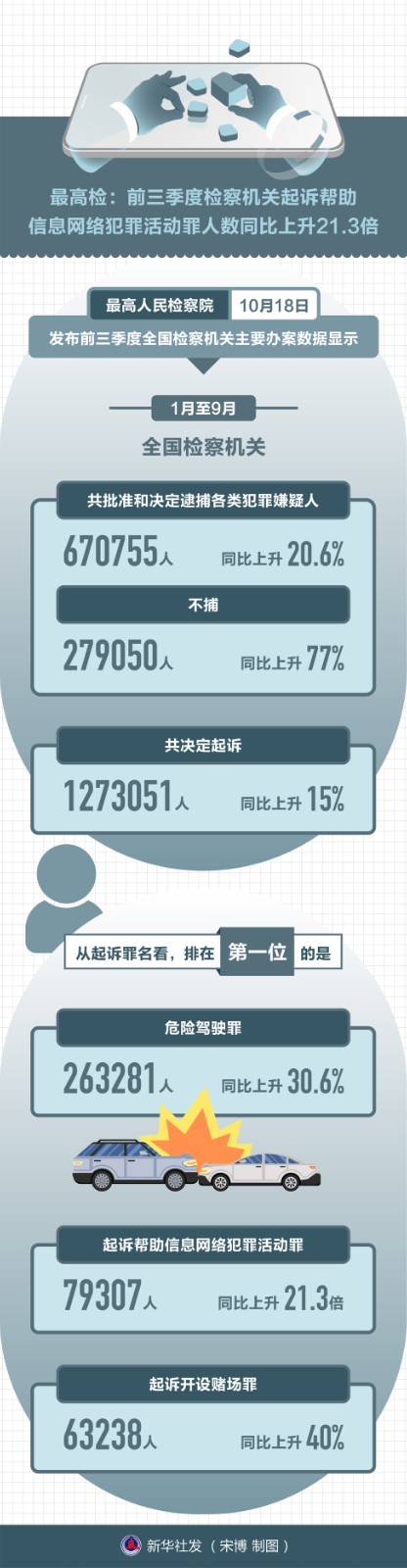 最高人民檢察院10月18日發(fā)布前三季度全國檢察機關(guān)主要辦案數(shù)據(jù)顯示,1月至9月,全國檢察機關(guān)共批準(zhǔn)和決定逮捕各類犯罪嫌疑人670755人,同比上升20.6%,不捕279050人,同比上升77%;共決定起訴1273051人,同比上升15%。