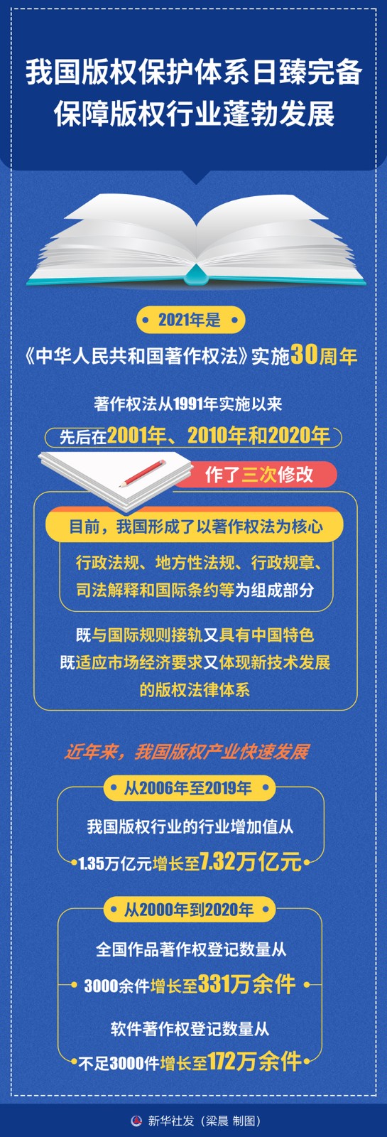 2021年是《中華人民共和國著作權(quán)法》實(shí)施30周年,記者從10月16日在杭州開幕的第八屆中國國際版權(quán)博覽會(huì)上獲悉,30年來我國版權(quán)保護(hù)體系日臻完備,保障版權(quán)行業(yè)蓬勃發(fā)展。