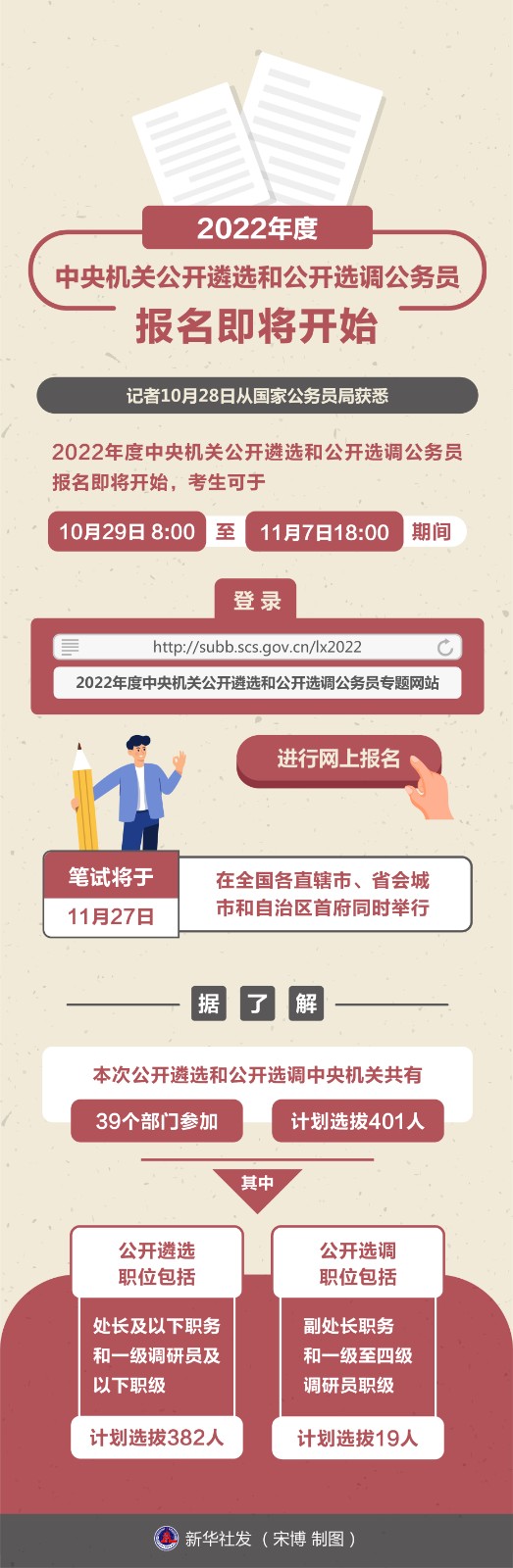 記者10月28日從國家公務(wù)員局獲悉,2022年度中央機關(guān)公開遴選和公開選調(diào)公務(wù)員報名即將開始,考生可于10月29日8:00至11月7日18:00期間,登錄“2022年度中央機關(guān)公開遴選和公開選調(diào)公務(wù)員專題網(wǎng)站”(http://subb.scs.gov.cn/lx2022)進行網(wǎng)上報名,筆試將于11月27日在全國各直轄市、省會城市和自治區(qū)首府同時舉行。