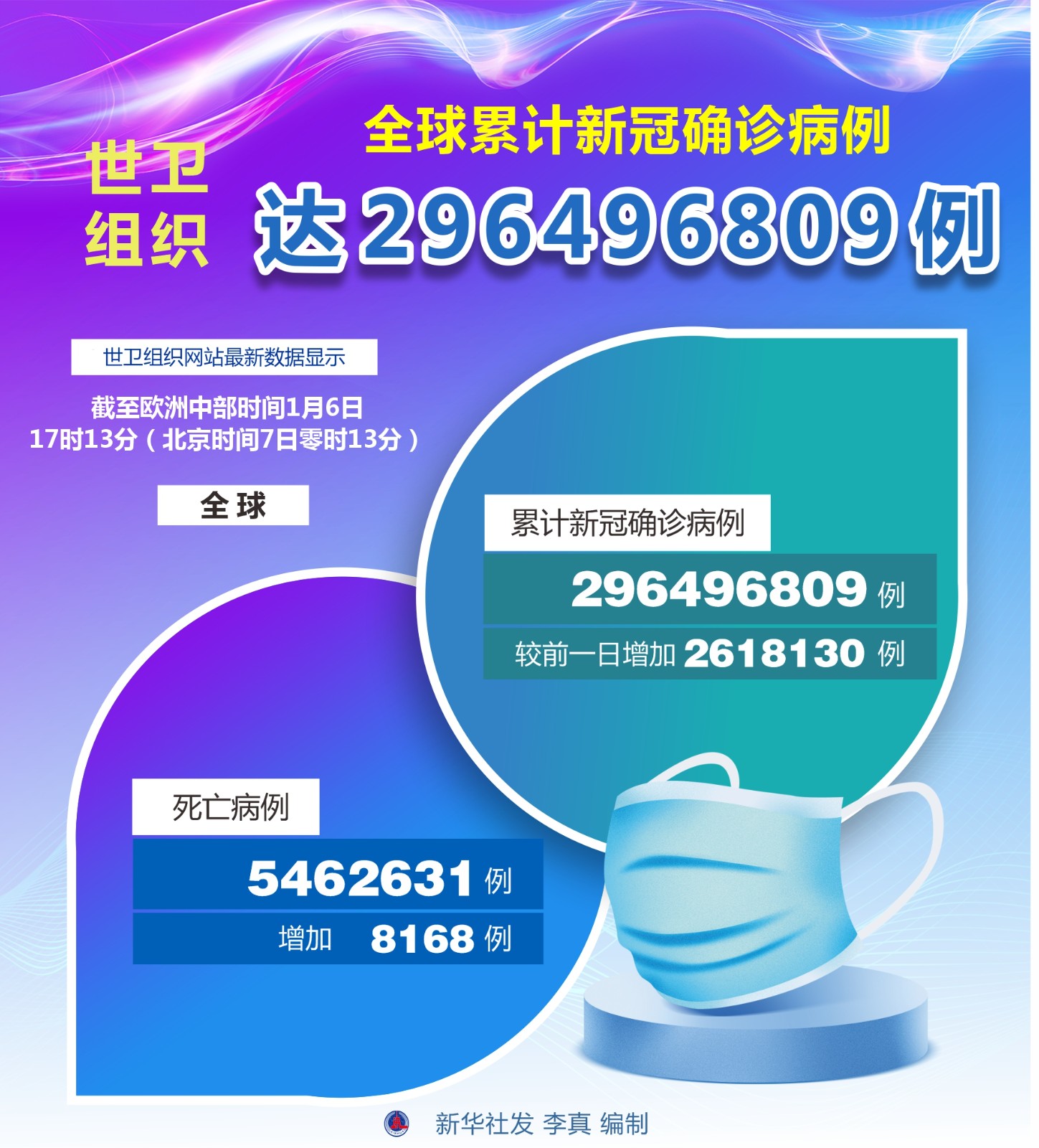 世界衛(wèi)生組織1月6日公布的最新數(shù)據(jù)顯示,全球累計(jì)新冠確診病例達(dá)296496809例。