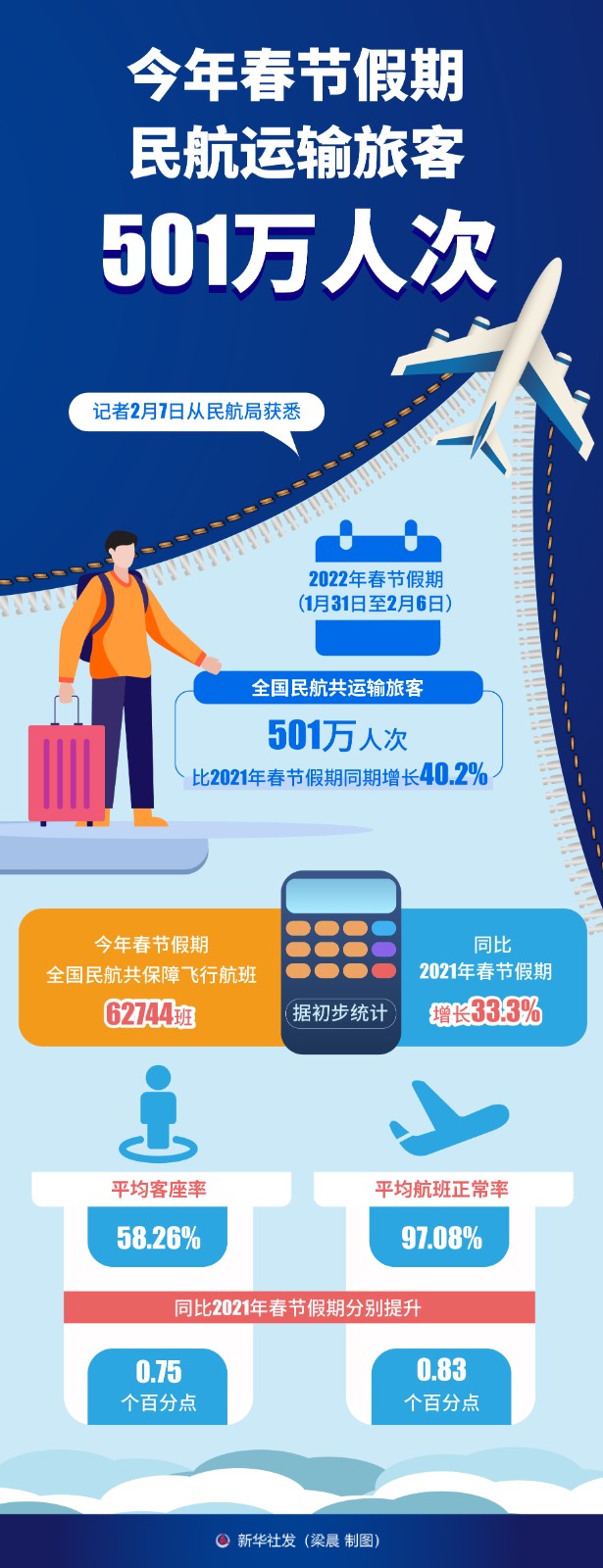 記者2月7日從民航局獲悉,2022年春節(jié)假期(1月31日至2月6日)全國民航共運輸旅客501萬人次,比2021年春節(jié)假期同期增長40.2%。