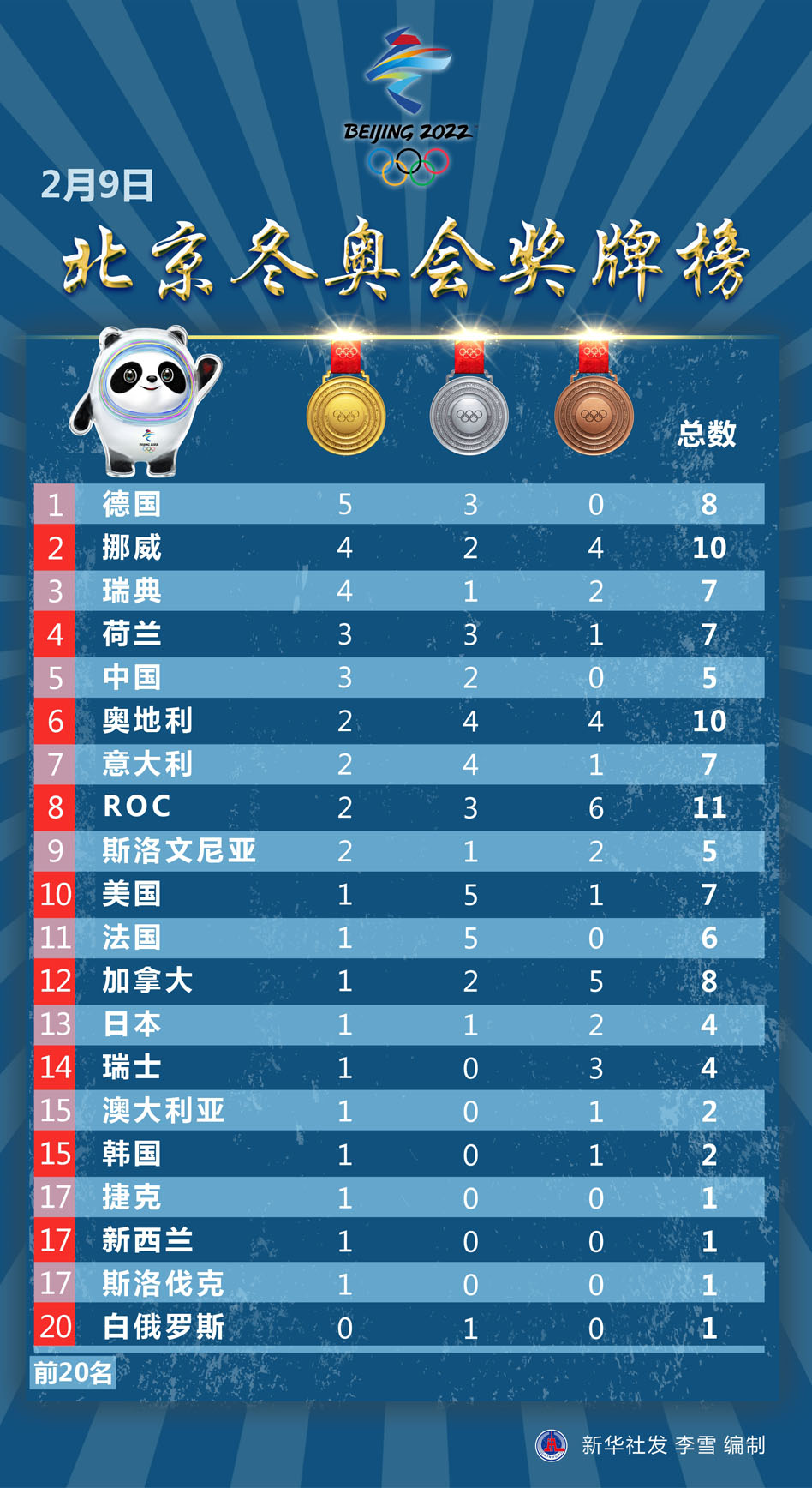 圖表:2月9日北京冬奧會(huì)獎(jiǎng)牌榜