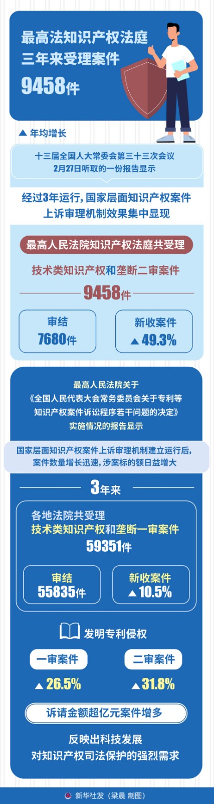 十三屆全國人大常委會第三十三次會議2月27日聽取的一份報告顯示,經(jīng)過3年運行,國家層面知識產(chǎn)權(quán)案件上訴審理機制效果集中顯現(xiàn),最高人民法院知識產(chǎn)權(quán)法庭共受理技術(shù)類知識產(chǎn)權(quán)和壟斷二審案件9458件,審結(jié)7680件,新收案件年均增長49.3%。