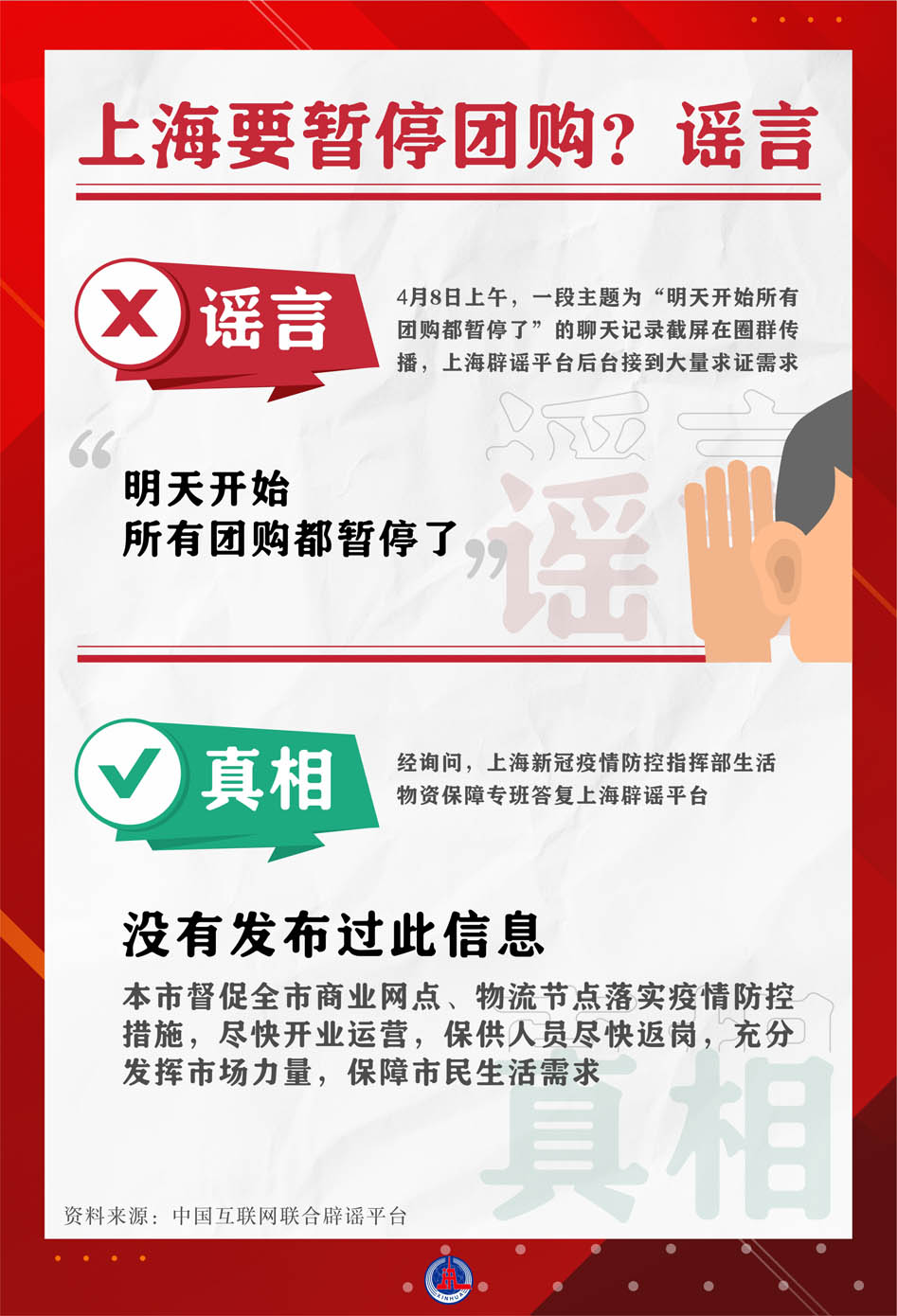 據(jù)上海網(wǎng)絡(luò)辟謠平臺(tái)消息:4月8日上午,一段主題為“明天開(kāi)始所有團(tuán)購(gòu)都暫停了”的聊天記錄截屏在圈群傳播,上海辟謠平臺(tái)后臺(tái)接到大量求證需求。