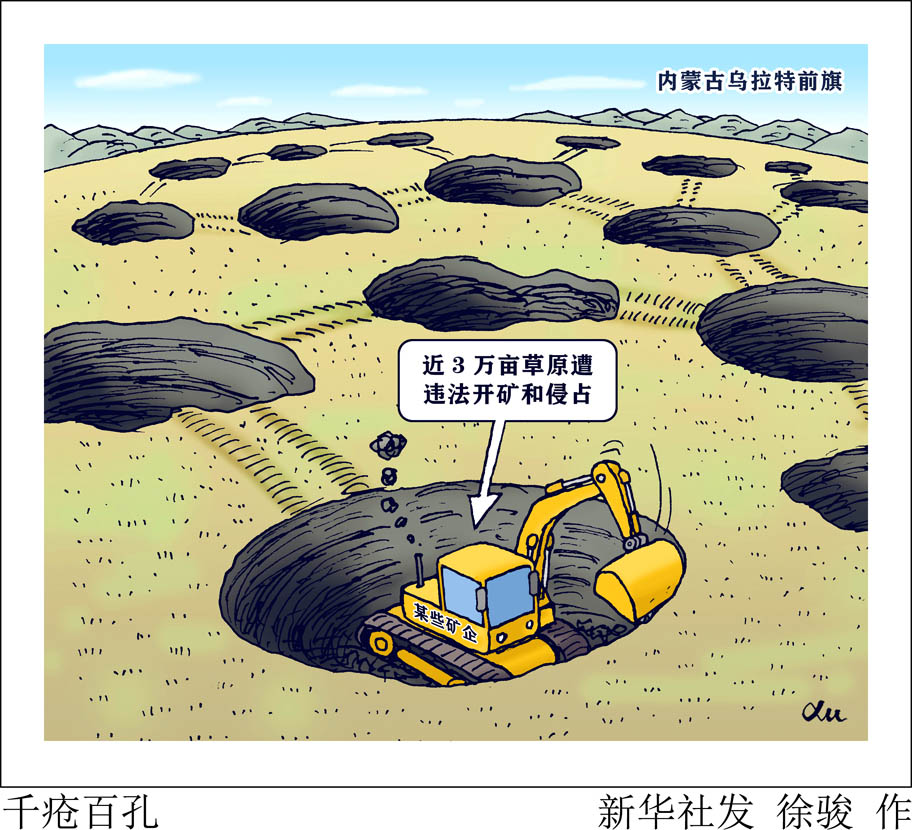 “新華視點(diǎn)”記者日前跟隨中央第三生態(tài)環(huán)境保護(hù)督察組督察發(fā)現(xiàn),內(nèi)蒙古自治區(qū)巴彥淖爾市烏拉特前旗礦山開(kāi)采長(zhǎng)期無(wú)序發(fā)展,近3萬(wàn)畝草原遭違法開(kāi)礦和侵占,使原本生態(tài)就脆弱的荒漠半荒漠草原遭受嚴(yán)重破壞。