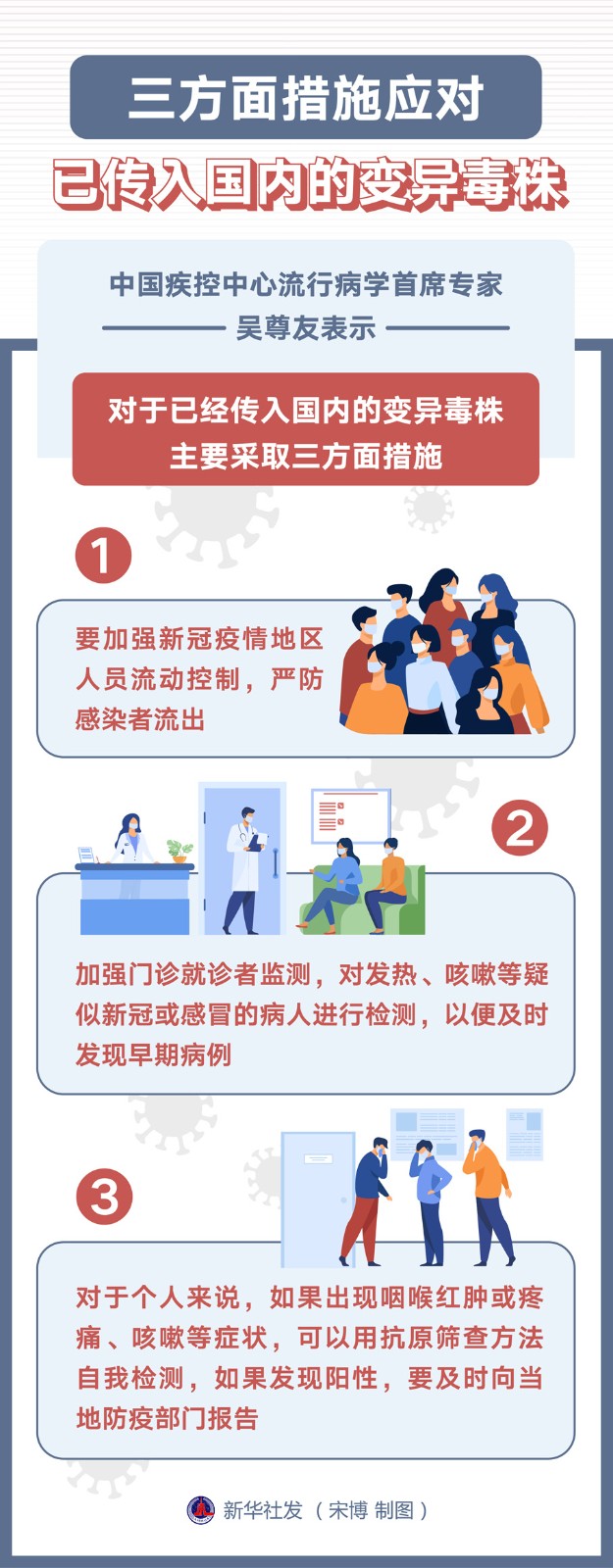 中國(guó)疾控中心流行病學(xué)首席專家吳尊友表示,對(duì)于已經(jīng)傳入國(guó)內(nèi)的變異毒株,主要采取三方面措施。