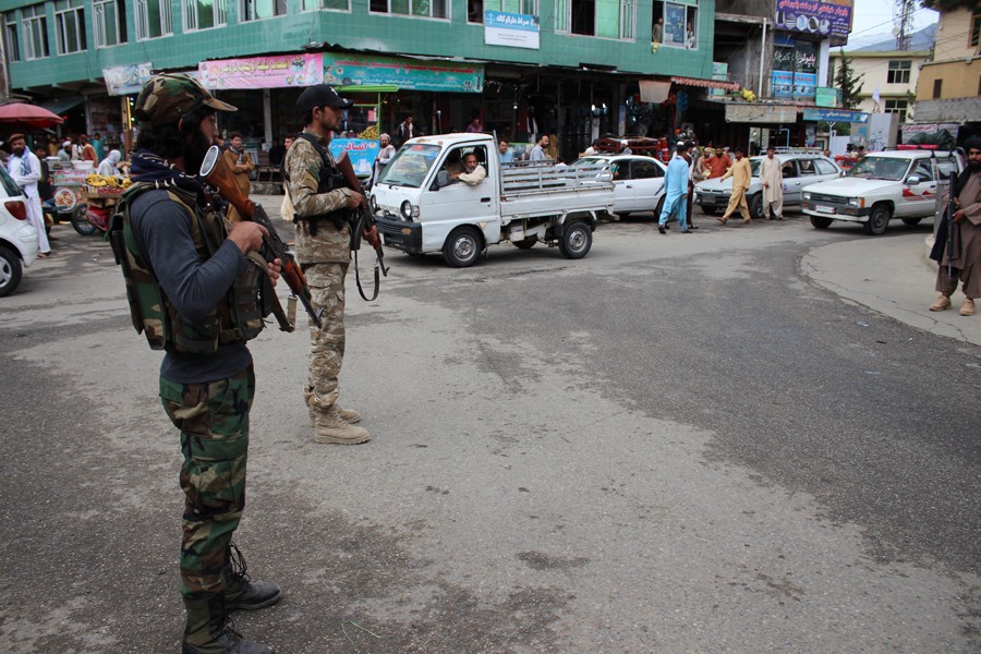 6月12日,在阿富汗庫(kù)納爾省首府阿薩達(dá)巴德市,塔利班安全人員在爆炸現(xiàn)場(chǎng)附近警戒。