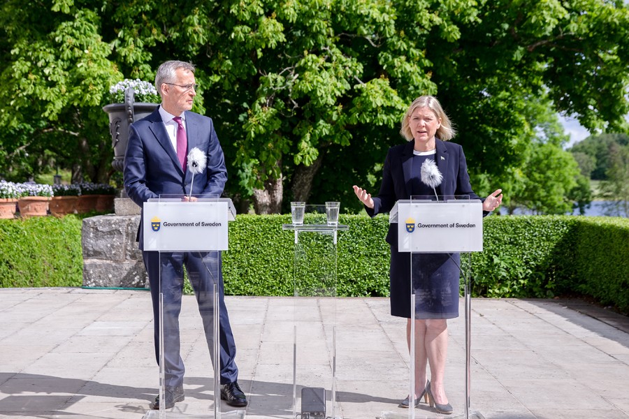 6月13日,瑞典首相安德松(右)與到訪的北約秘書長斯托爾滕貝格在瑞典首都斯德哥爾摩以西約120公里的哈普松德首相夏季莊園出席新聞發(fā)布會(huì)。