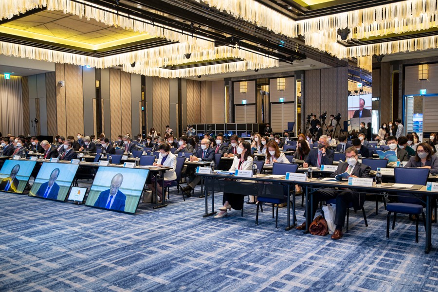 這是6月14日在韓國首爾拍攝的2022年中日韓合作國際論壇現(xiàn)場。