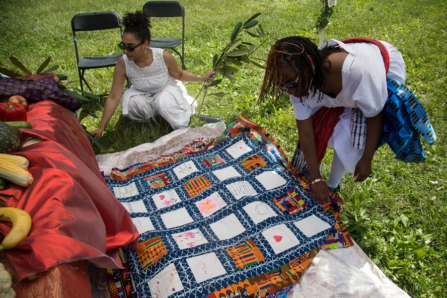 6月19日是美國的六月節(jié),也是紀(jì)念和慶祝美國黑人奴隸獲得解放的日子。在紐約展望公園六月節(jié)慶祝活動現(xiàn)場的一個臨時帳篷里,一場悼念新冠逝者的拼布活動,氣氛肅穆,與周圍歡樂的氣氛顯得有些格格不入。拼布作品由許多小方塊織物縫合而成,每塊織物代表了活動參加者對死于新冠的親人的思念和追憶?;顒咏M織方鼓勵更多人帶來逝去親人曾穿過衣物的布片,以便縫制一塊更大的拼布。