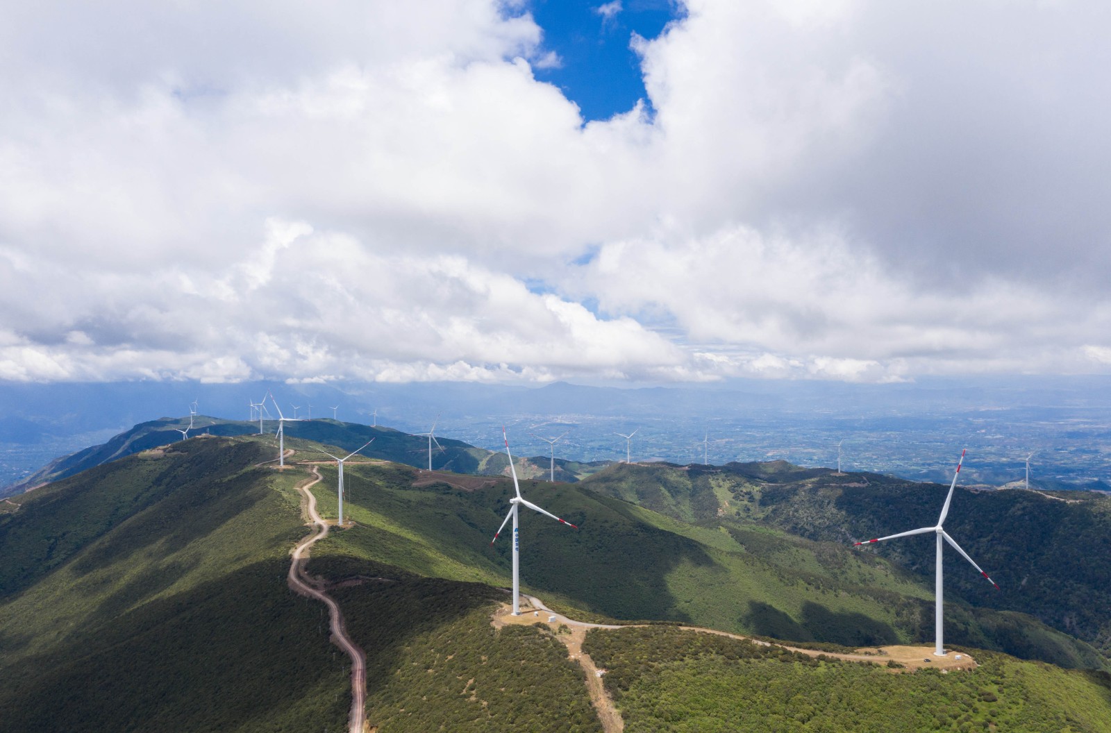 這是位于四川鹽源縣平川鎮(zhèn)的四川鹽源華電新能源有限公司的小高山風(fēng)電場(chǎng)一角(6月20日攝,無(wú)人機(jī)照片)。