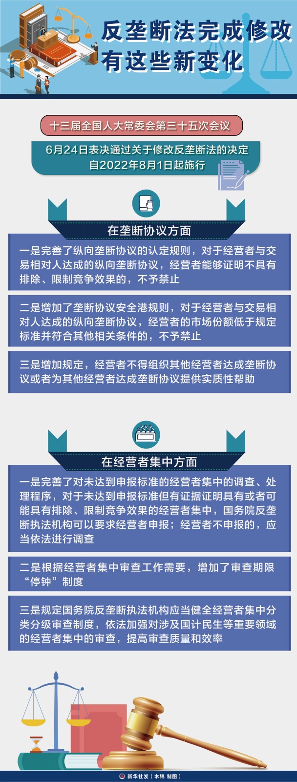 十三屆全國(guó)人大常委會(huì)第三十五次會(huì)議6月24日表決通過(guò)關(guān)于修改反壟斷法的決定,自2022年8月1日起施行。這是反壟斷法自2008年實(shí)施以來(lái)的首次修改,旨在維護(hù)公平競(jìng)爭(zhēng)秩序,健全統(tǒng)一、開(kāi)放、競(jìng)爭(zhēng)、有序的市場(chǎng)體系。