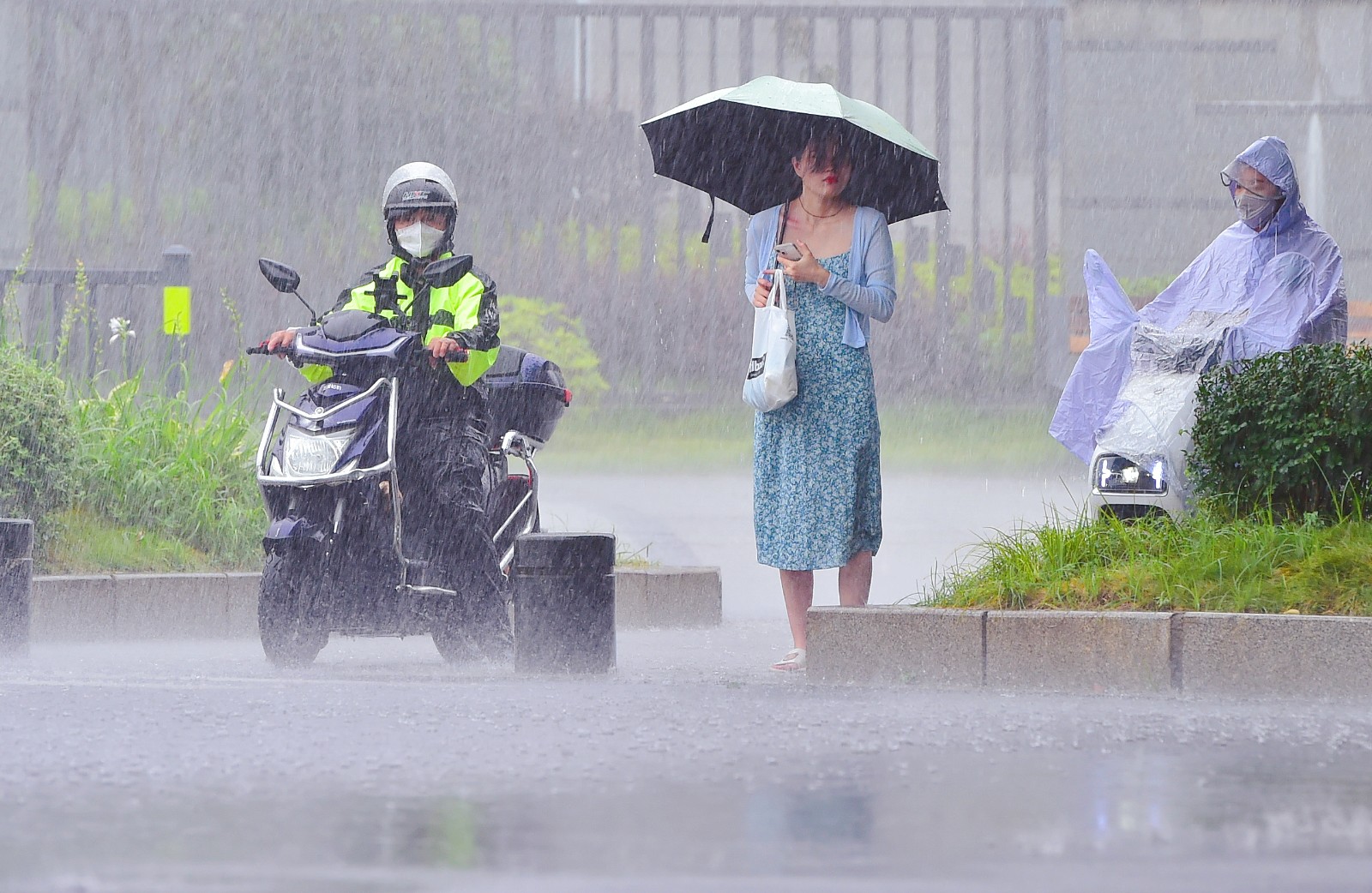 6月29日,行人和車輛在暴雨中行進。