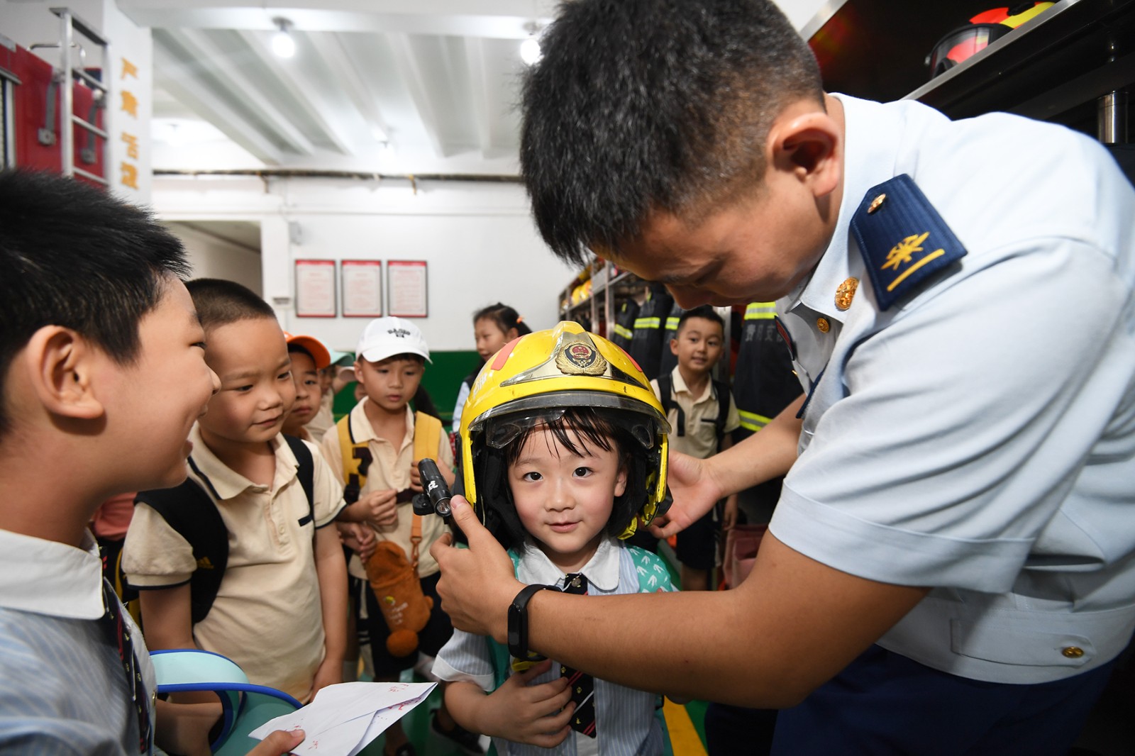 6月30日,貴州省貴陽市第十一幼兒園的小朋友在貴陽市南明區(qū)消防救援大隊體驗(yàn)消防救援頭盔。