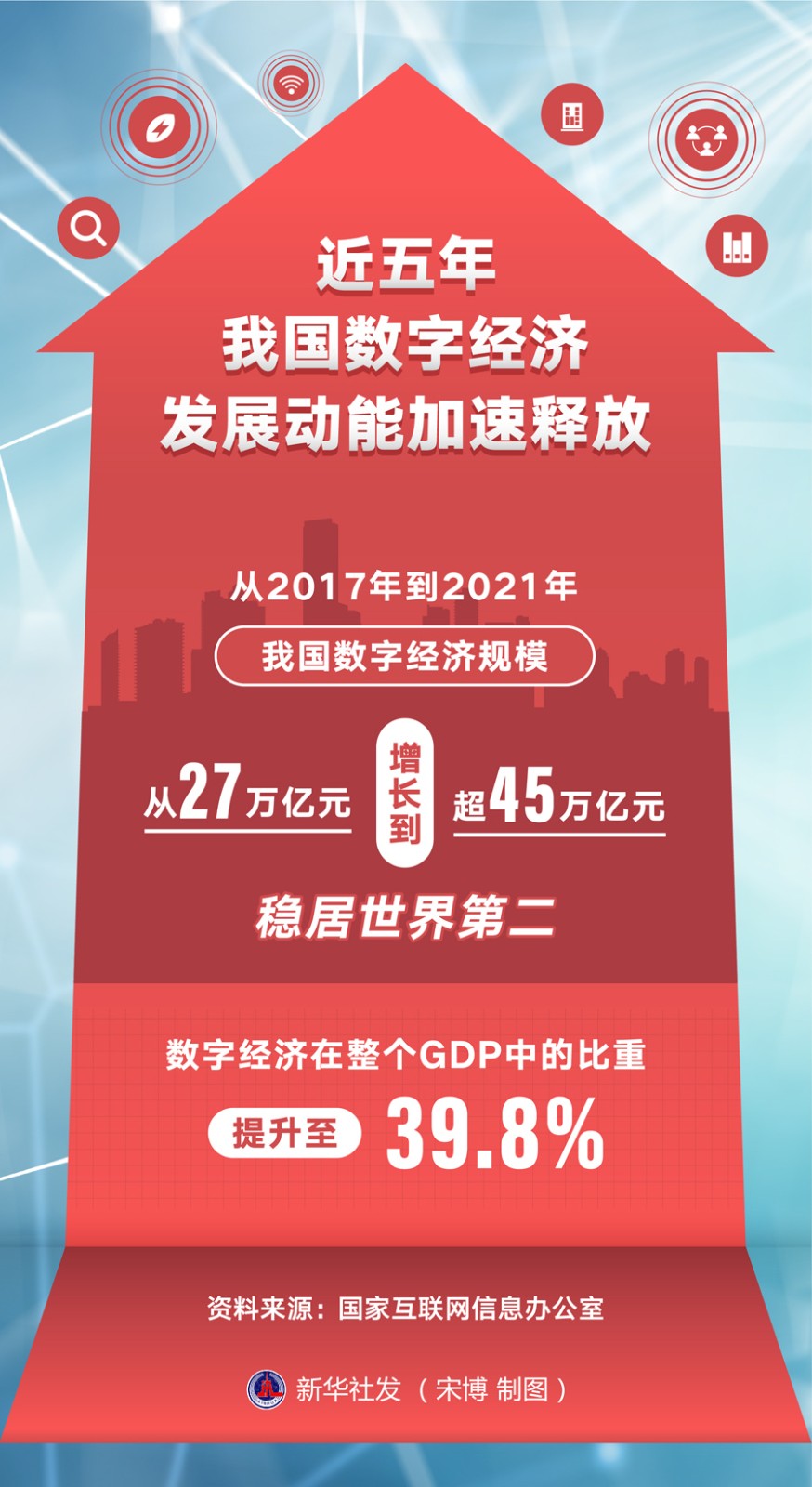 “從2017年到2021年,我國數(shù)字經(jīng)濟(jì)規(guī)模從27萬億元增長到超45萬億元,穩(wěn)居世界第二。數(shù)字經(jīng)濟(jì)在整個GDP中的比重提升至39.8%?!眹一ヂ?lián)網(wǎng)信息辦公室副主任曹淑敏7月5日在第五屆數(shù)字中國建設(shè)峰會新聞發(fā)布會上表示,黨的十九大以來,數(shù)字經(jīng)濟(jì)發(fā)展動能加速釋放。