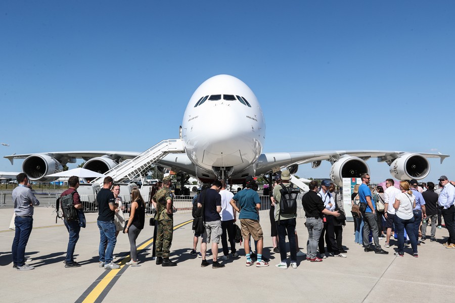 6月22日,在德國首都柏林南郊,人們排隊(duì)準(zhǔn)備參觀阿聯(lián)酋航空公司空中客車A380-800客機(jī)。