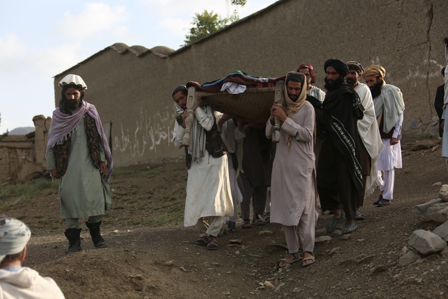6月23日,在阿富汗帕克提卡省一座村莊,人們轉移地震遇難者的遺體。