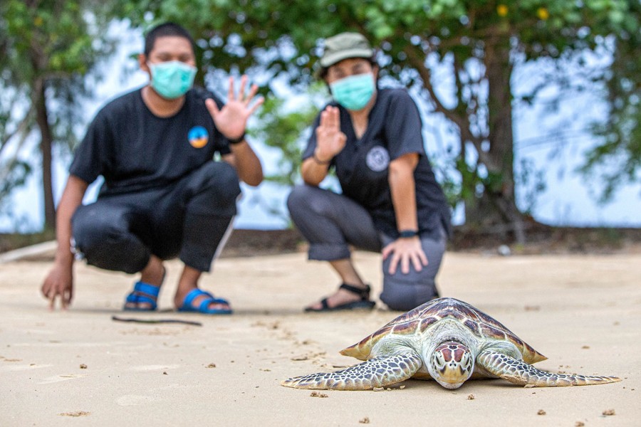 6月21日,在泰國羅勇府蒙奈島海龜保護中心,南塔日卡博士(右)和同事將海龜放歸自然。