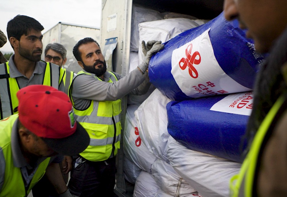 6月27日,中國政府援助阿富汗首批抗震救災(zāi)物資運抵阿富汗首都喀布爾機(jī)場(視頻截圖)。