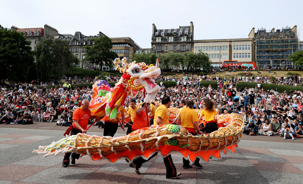 7月17日,在英國蘇格蘭愛丁堡,當?shù)孛癖娪^看舞龍表演。