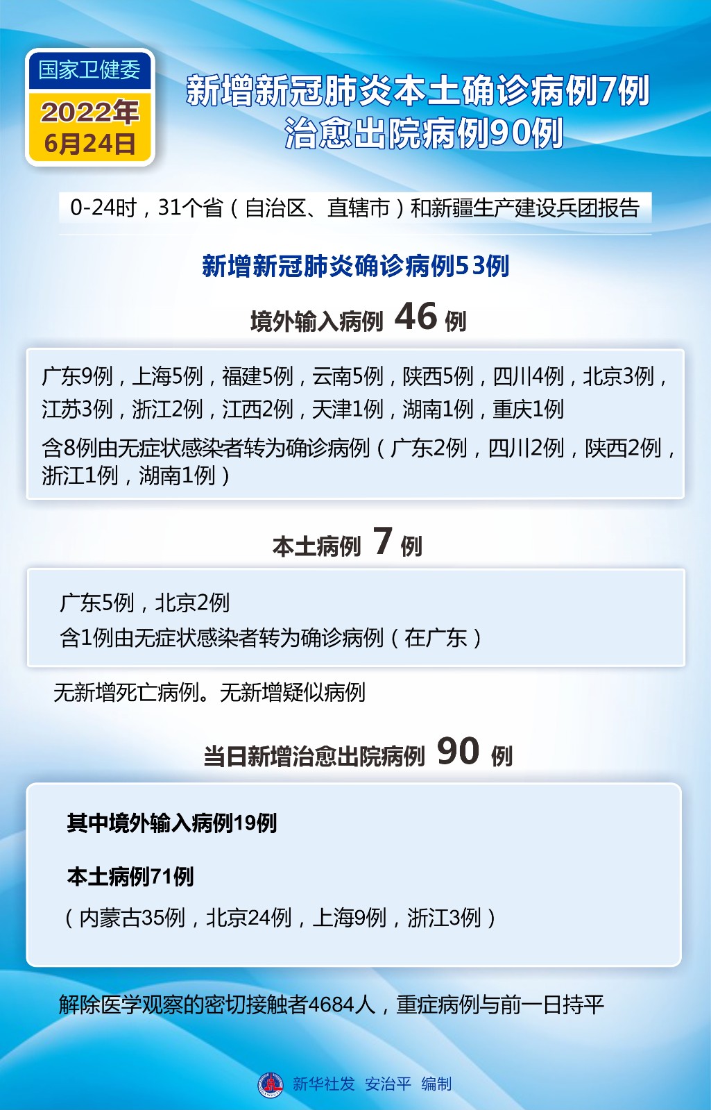 圖表:國家衛(wèi)健委:6月24日新增新冠肺炎本土確診病例7例 治愈出院病例90例