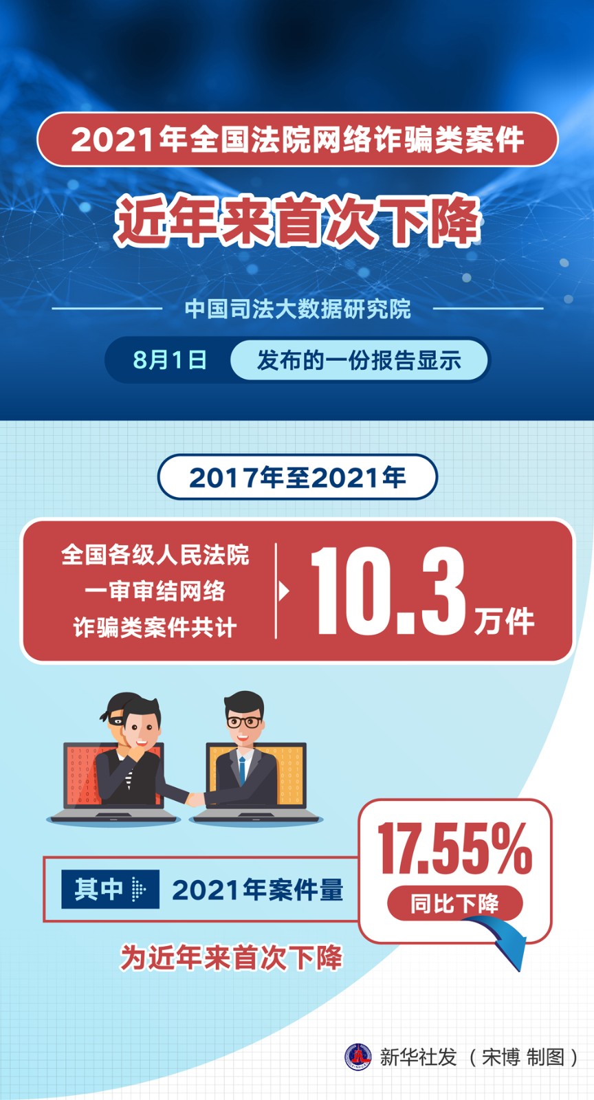 中國司法大數(shù)據(jù)研究院8月1日發(fā)布的一份報告顯示,2017年至2021年全國各級人民法院一審審結(jié)網(wǎng)絡(luò)詐騙類案件共計10.3萬件,其中2021年案件量同比下降17.55%,為近年來首次下降。