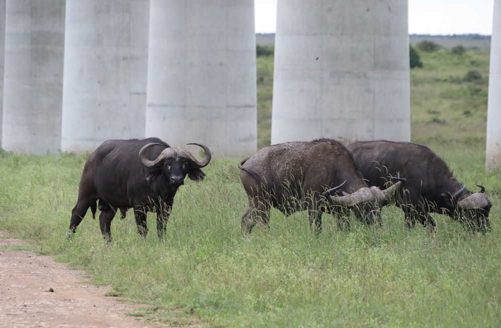 幾頭水牛在肯尼亞內(nèi)羅畢國(guó)家公園特大橋下吃草(2021年5月19日攝)。