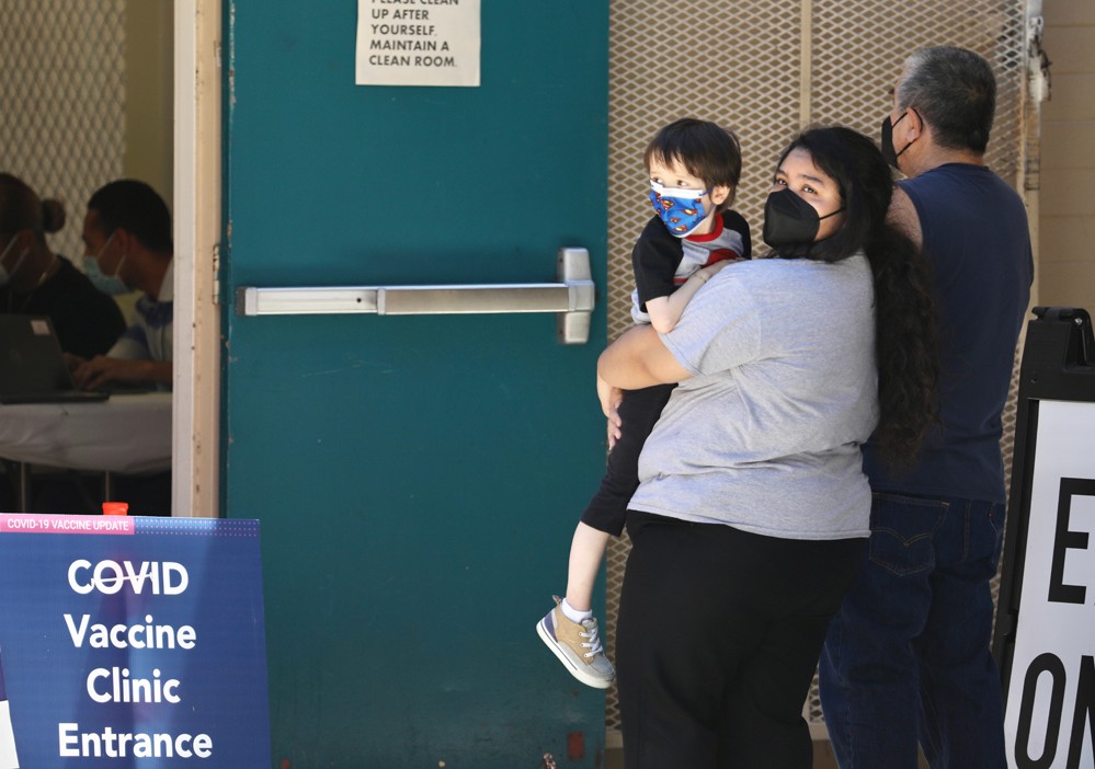 8月5日,在美國加利福尼亞州洛杉磯縣,戴著口罩的當(dāng)?shù)鼐用竦却臃N新冠疫苗。