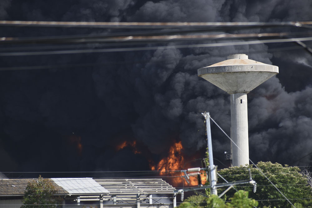 8月7日,古巴馬坦薩斯省火災(zāi)現(xiàn)場的儲油罐繼續(xù)燃燒并冒出濃煙。
