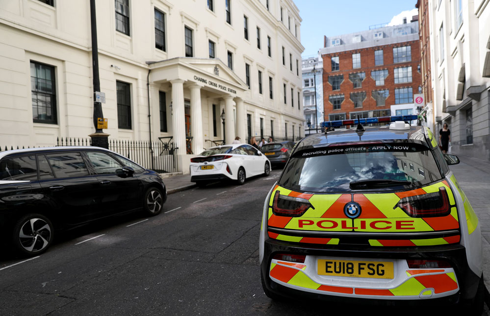 8月8日,在英國倫敦,一輛警車停在警察局門口。