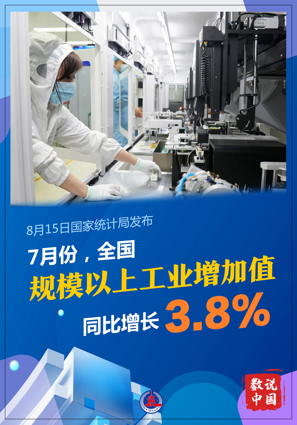 國家統(tǒng)計(jì)局8月15日發(fā)布數(shù)據(jù)顯示,7月份,全國規(guī)模以上工業(yè)增加值同比增長3.8%,比上月回落0.1個百分點(diǎn);環(huán)比增長0.38%。