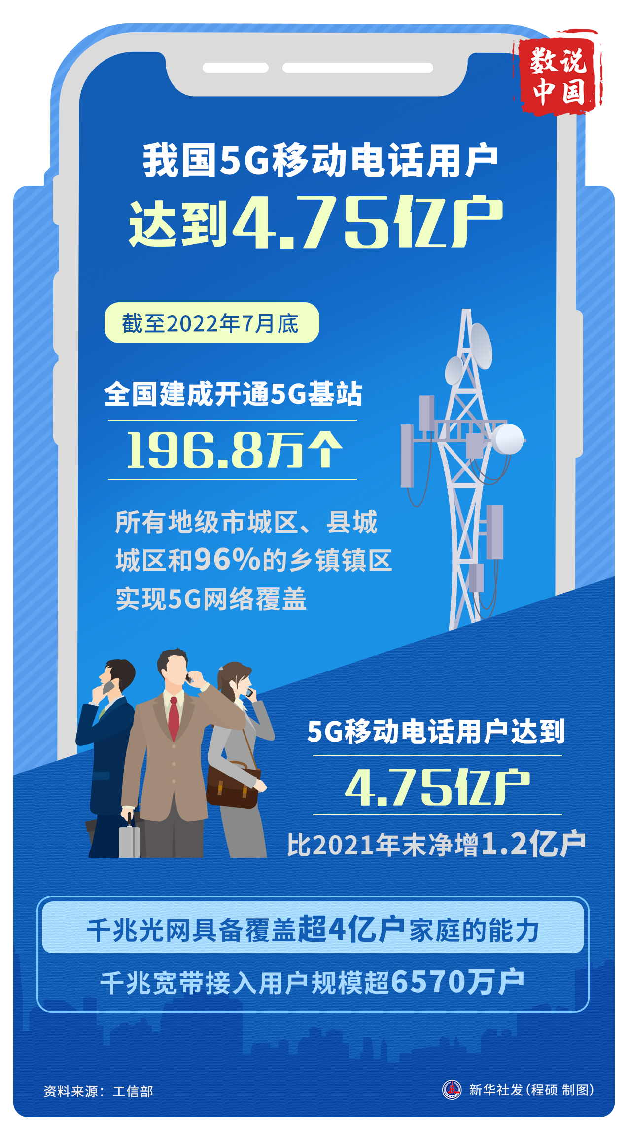 工信部信息通信發(fā)展司司長謝存8月19日表示,截至7月底,全國建成開通5G基站196.8萬個,所有地級市城區(qū)、縣城城區(qū)和96%的鄉(xiāng)鎮(zhèn)鎮(zhèn)區(qū)實(shí)現(xiàn)5G網(wǎng)絡(luò)覆蓋,5G移動電話用戶達(dá)到4.75億戶,比2021年末凈增1.2億戶,千兆光網(wǎng)具備覆蓋超4億戶家庭的能力,千兆寬帶接入用戶規(guī)模超6570萬戶。