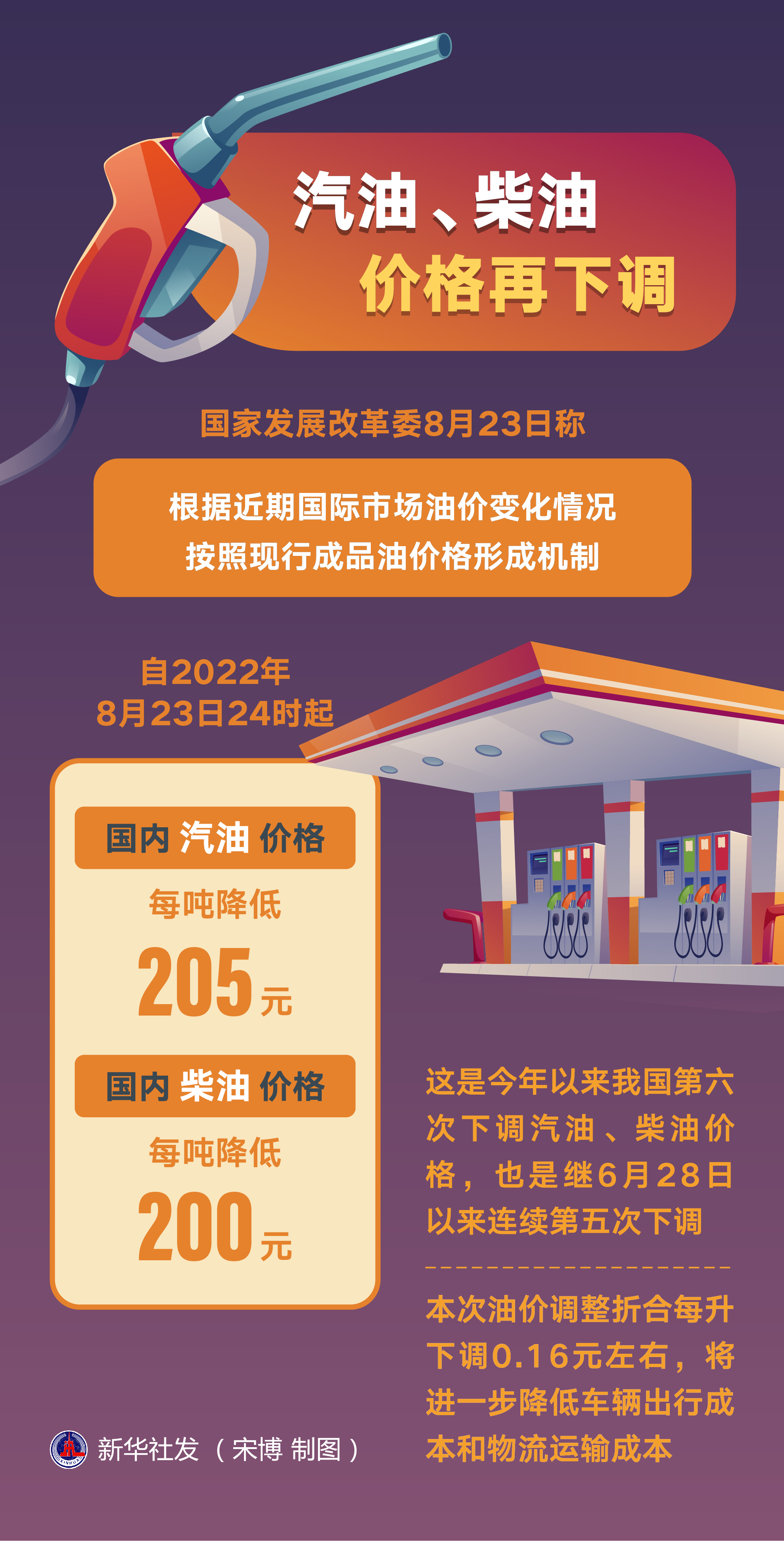 國家發(fā)展改革委8月23日稱,根據(jù)近期國際市場油價變化情況,按照現(xiàn)行成品油價格形成機(jī)制,自2022年8月23日24時起,國內(nèi)汽油、柴油價格每噸分別降低205元和200元。