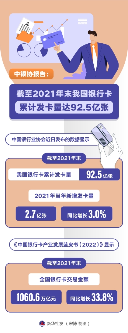 中國銀行業(yè)協(xié)會近日發(fā)布的數(shù)據(jù)顯示,截至2021年末,我國銀行卡累計(jì)發(fā)卡量達(dá)92.5億張,2021年當(dāng)年新增發(fā)卡量2.7億張,同比增長3.0%。