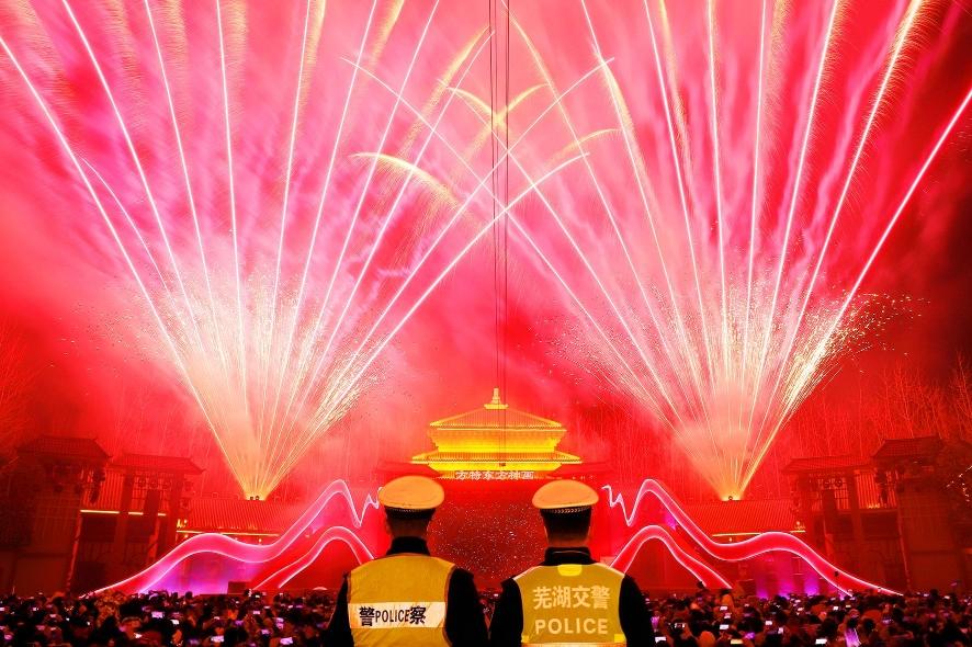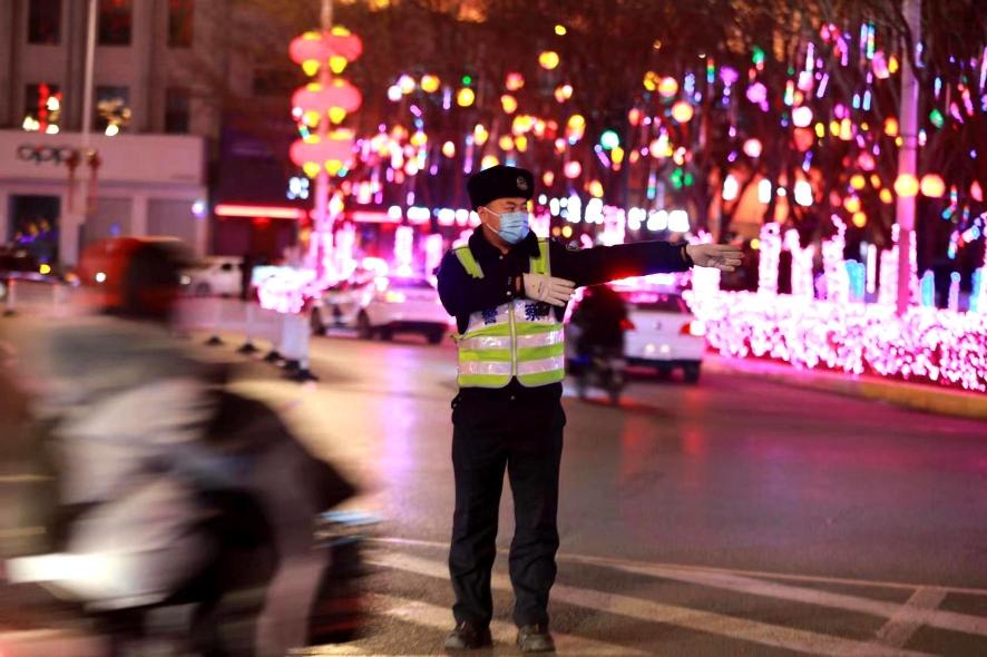 1月22日,大年初一,安徽省蕪湖市公安局交警支隊(duì)鳩江大隊(duì)民警在方特東方神畫(huà)景區(qū)堅(jiān)守崗位,確保游客安全有序觀(guān)賞燈展晚會(huì)。