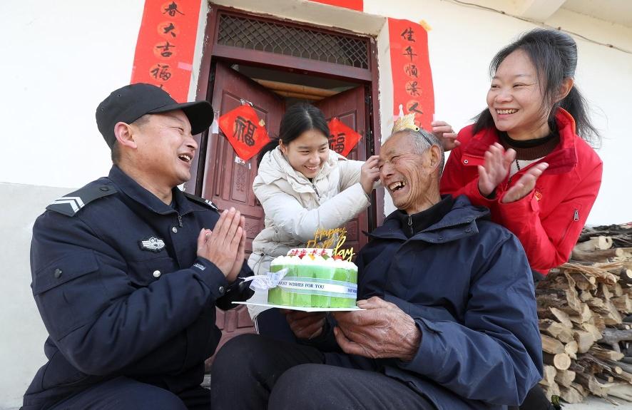1月25日,湖北省荊門(mén)市公安局掇刀區(qū)·高新區(qū)分局“村警”和村干部為84歲的獨(dú)居老人過(guò)生日。